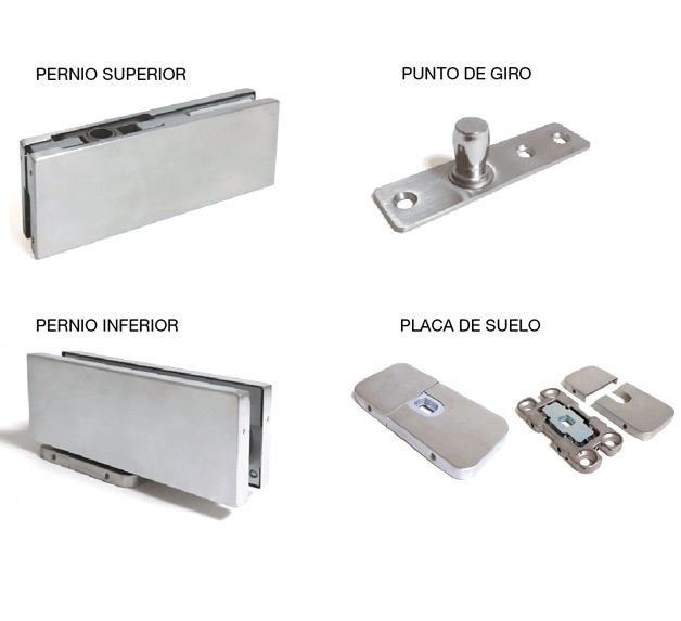 Els components del kit són: un perni-fre inferior, un perni alt amb l'eix de gir amb rodaments inox, un punt de gir superior i una placa de sòl regulable amb kit de fixació inclòs.