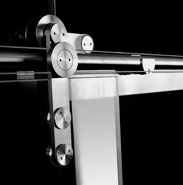 Nou sistema SV-I120 SINCRO, un sistema de dues fulles sincronitzades de fins a 120 kg per fulla, en acer inoxidable. El perfil superior de forma circular té larobustesa per suportar el pes de diferents fulles col·locant els suports en els llocs indicats. Les roldanes són de rodaments a boles i d'acer inoxidable. El model disposa de suports per a paret i vidre, segons el tipus d'instal·lació a realitzar, també d'acer inoxidable i banda de rodadura de nylon negre. També disposa de guiador inferior. Un dels requisits de SV-I120 SINCRO és que les fulles de vidre siguin temperades ja que són mecanitzades. L'espectacularitat d'aquest model ve donada pel seu disseny i per tots els seus mecanismes visibles. Vidre 10/12 mm. Acabat: Inox mat.