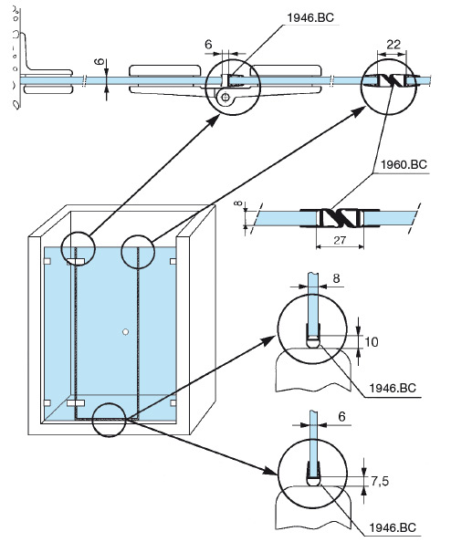 Para vidrio de 6 a 8 mm. Montaje con muesca 3062E 180 para 2 hojas a 180 . Montaje con muesca 3062E 135 para 2 hojas a 135 . Material: Lat n. Eje inoxidable. Peso m ximo por hoja: 25 kg, para un peso superior colocar una tercera bisagra. Se suministra con juntas. *** TODOS LOS PRODUCTOS ASSA ABLOY BA O TIENEN 7 A OS DE GARANT A ***